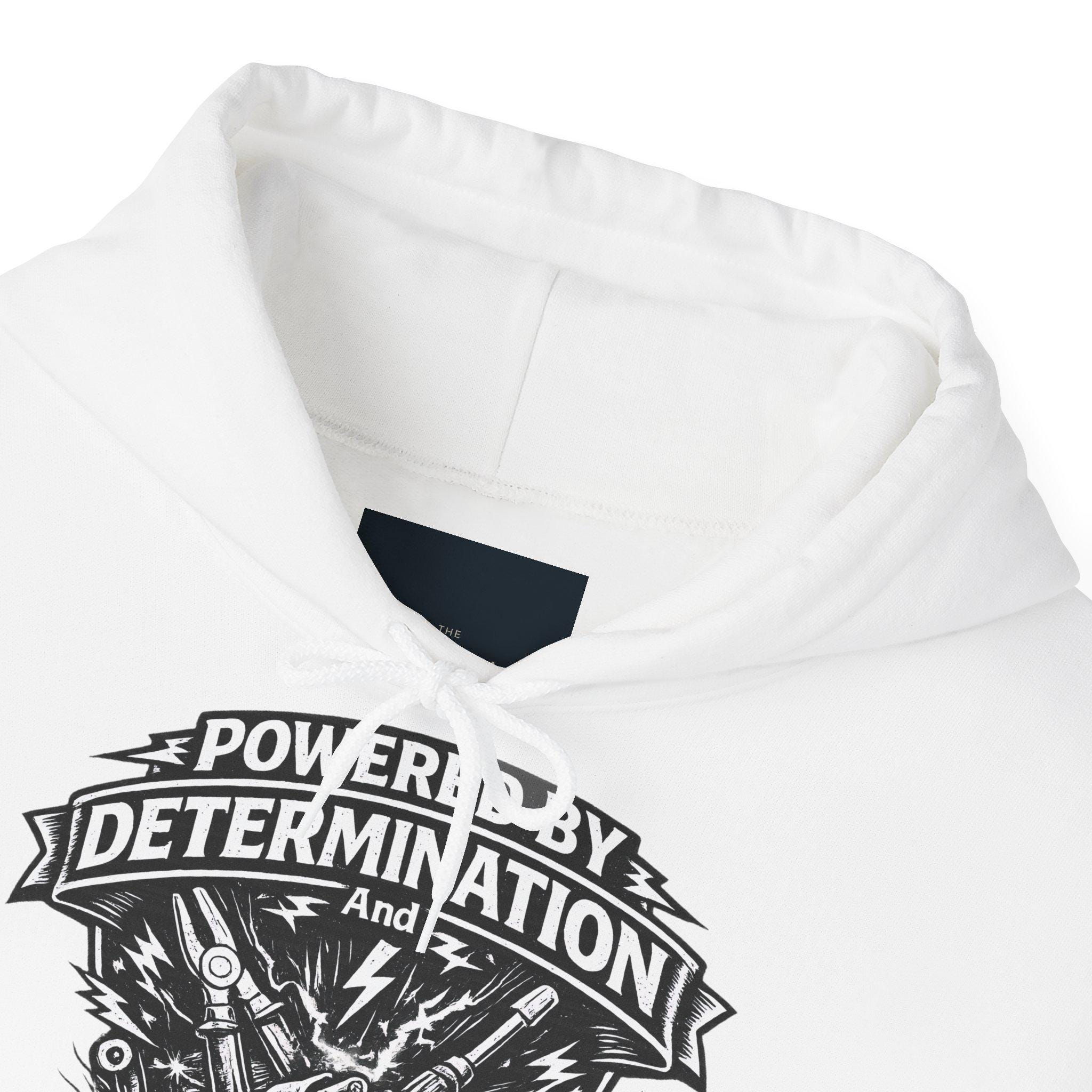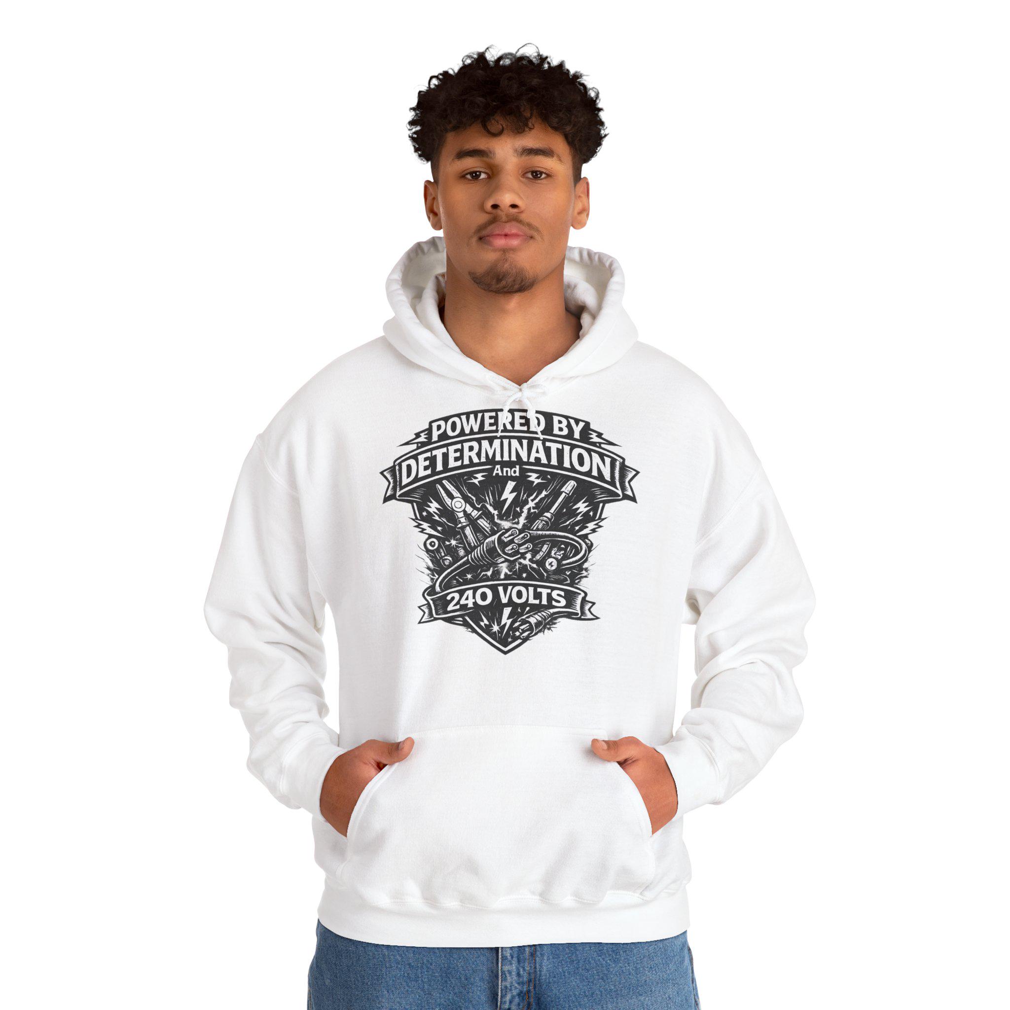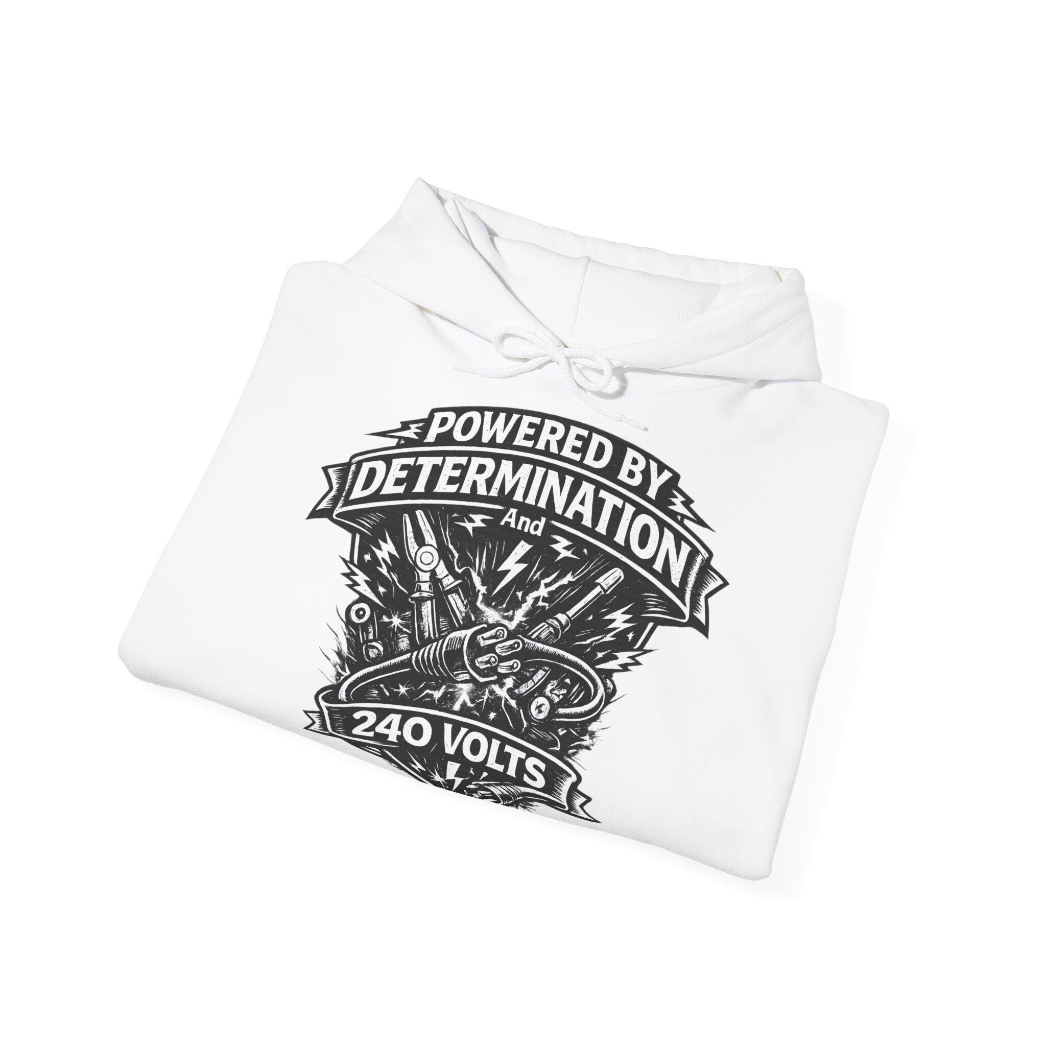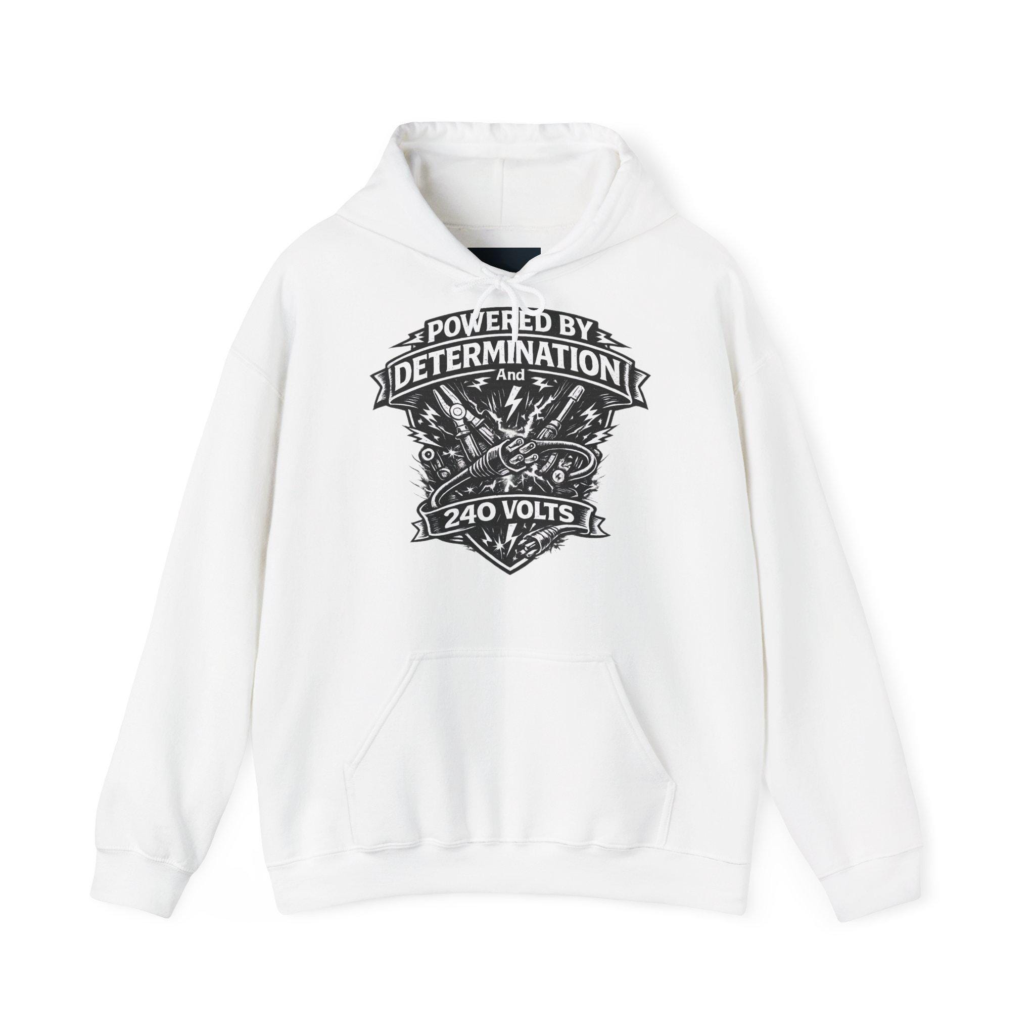 This mid-weight hooded sweatshirt blends workshop grit with everyday comfort. A bold black crest-style print — complete with lightning bolts, tools, and the slogan “Powered by Determination and 240 Volts” — sits over the heart, giving the hoodie a handcrafted, blue-collar vibe. The roomy kangaroo pocket and double-lined hood make it easy to layer over work shirts or streetwear. Soft yet durable (50/50 cotton-poly), it wears well during long days on-site, late-night projects, or casual weekend hangs. Subtle details like the color-matched drawcord and tear-away label keep the look clean while the tubular knit eliminates side seams for a smooth fit. Choose embroidery on the chest or wrist to personalize the piece with a name, crew tag, or logo.