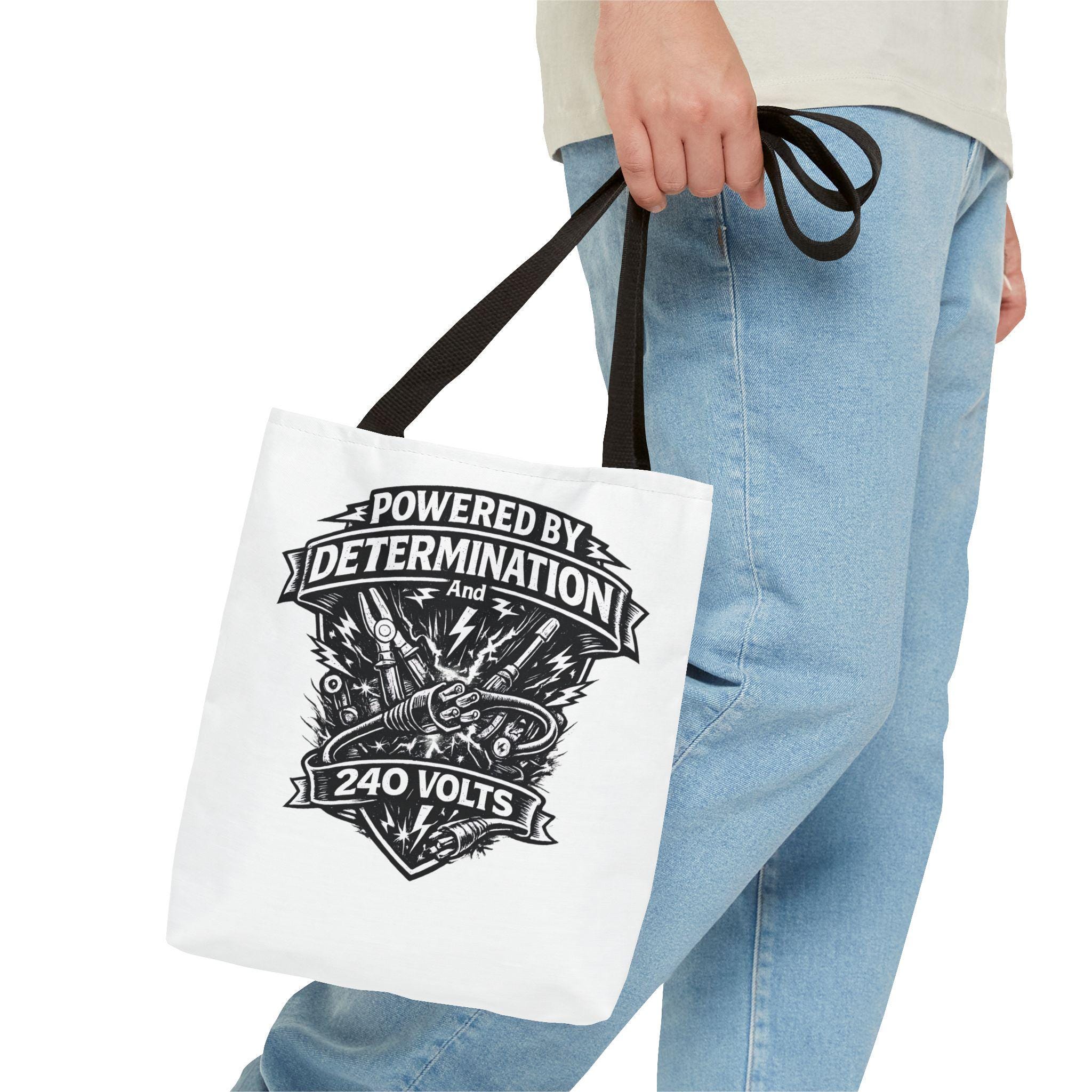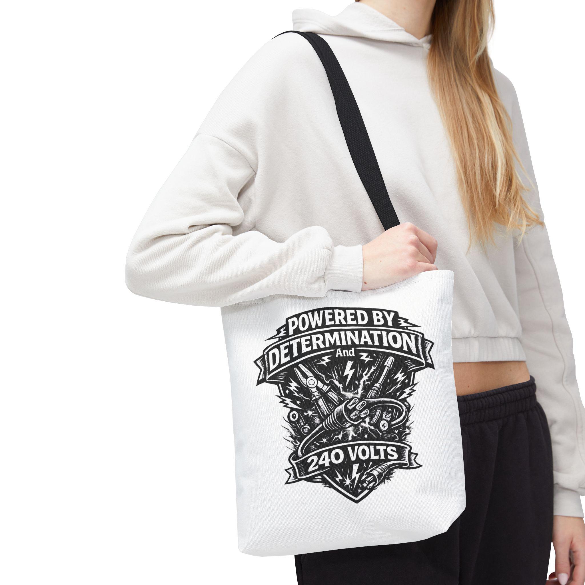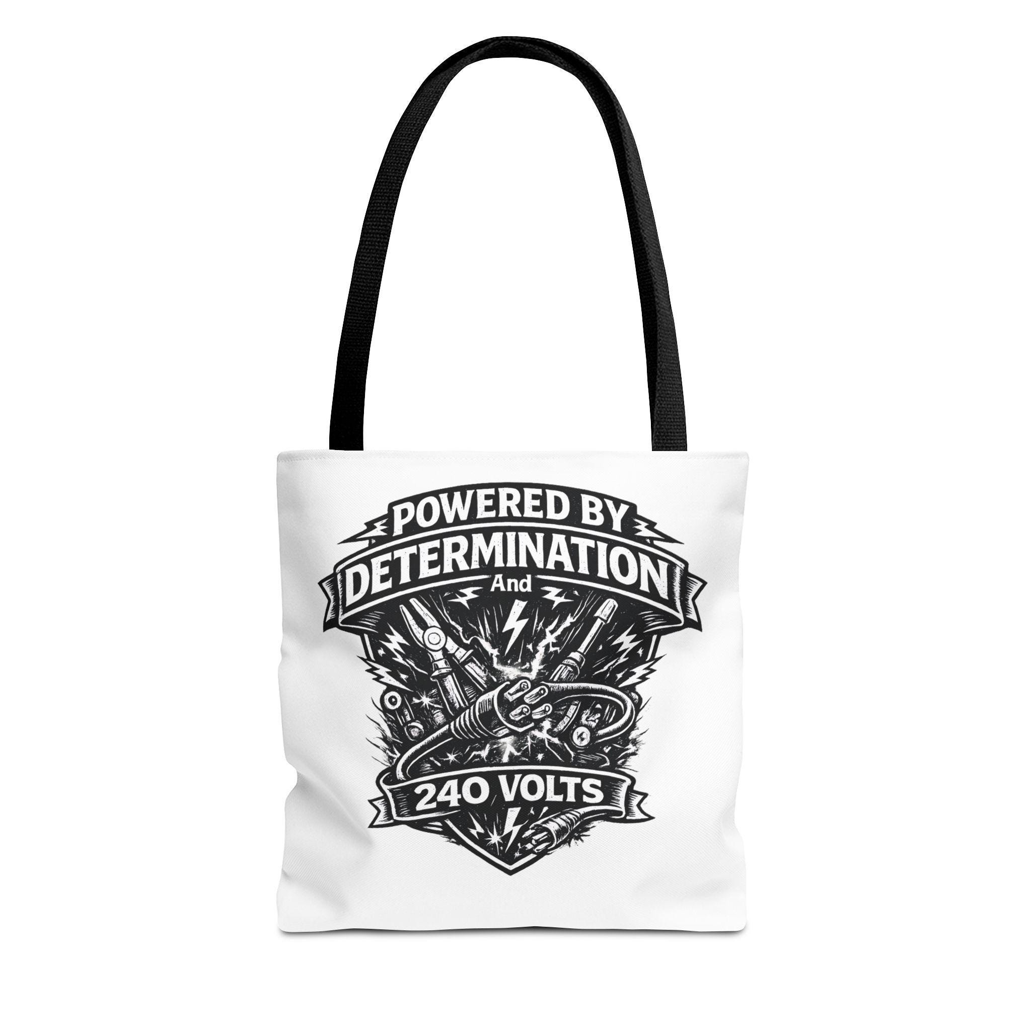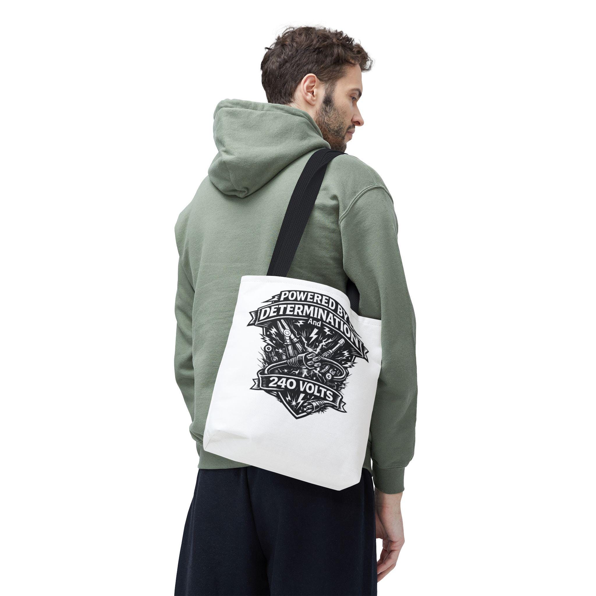 Lightweight, tough, and unapologetically bold — this printed tote carries more than errands. The sturdy polyester body holds its shape while boxed corners add roomy depth for tools, books, or a weekend haul. Black reinforced handles sit comfortably on the shoulder and match the inner stitching for a clean, purposeful look. The monochrome, mechanic-inspired badge design — “Powered by Determination and 240 Volts” — speaks to doers who take on projects with grit and a little humor. Bring it to the workshop, stack it with gear for a maker fair, or sling it over your shoulder on the daily commute. It’s built to travel hard and keep your essentials organized without fuss.